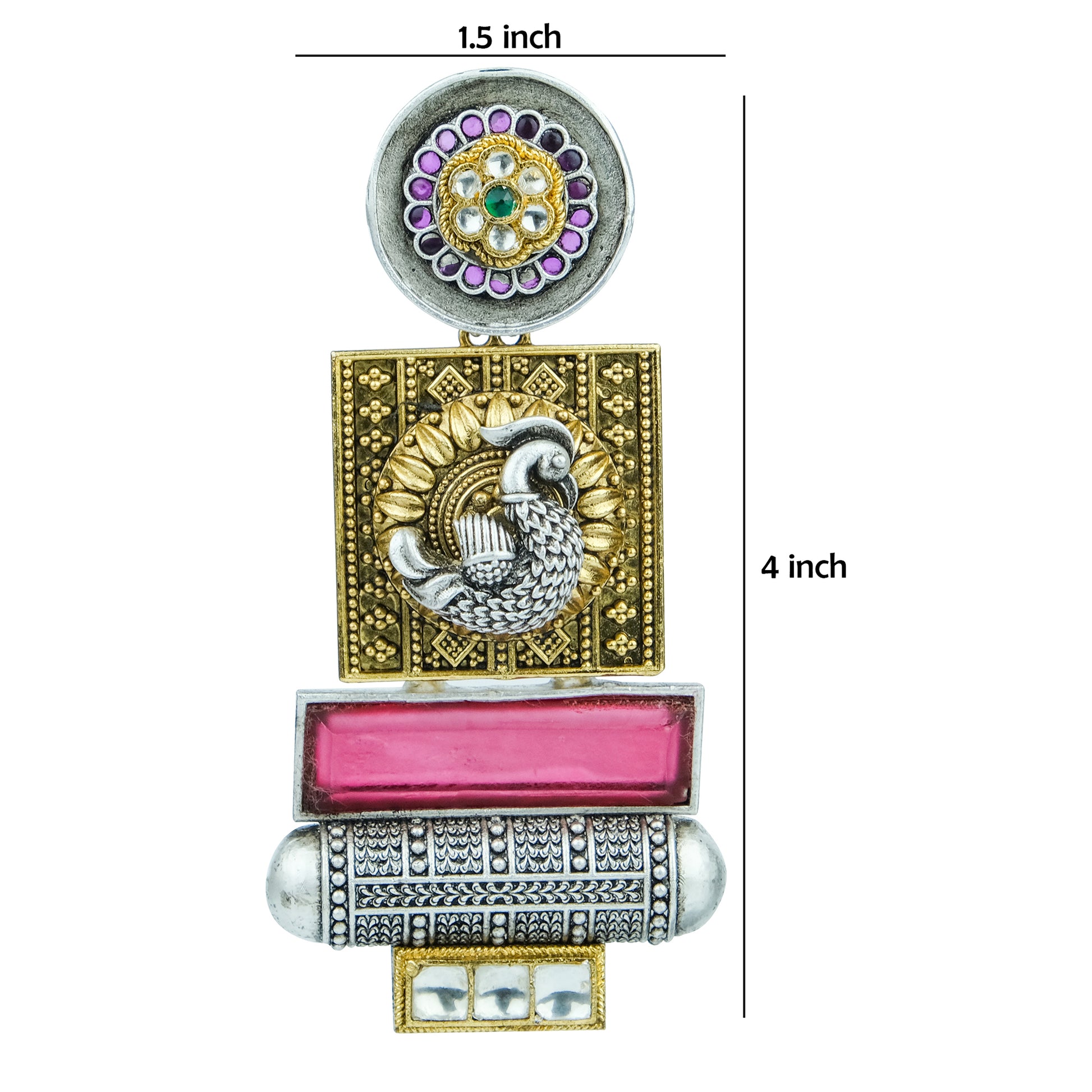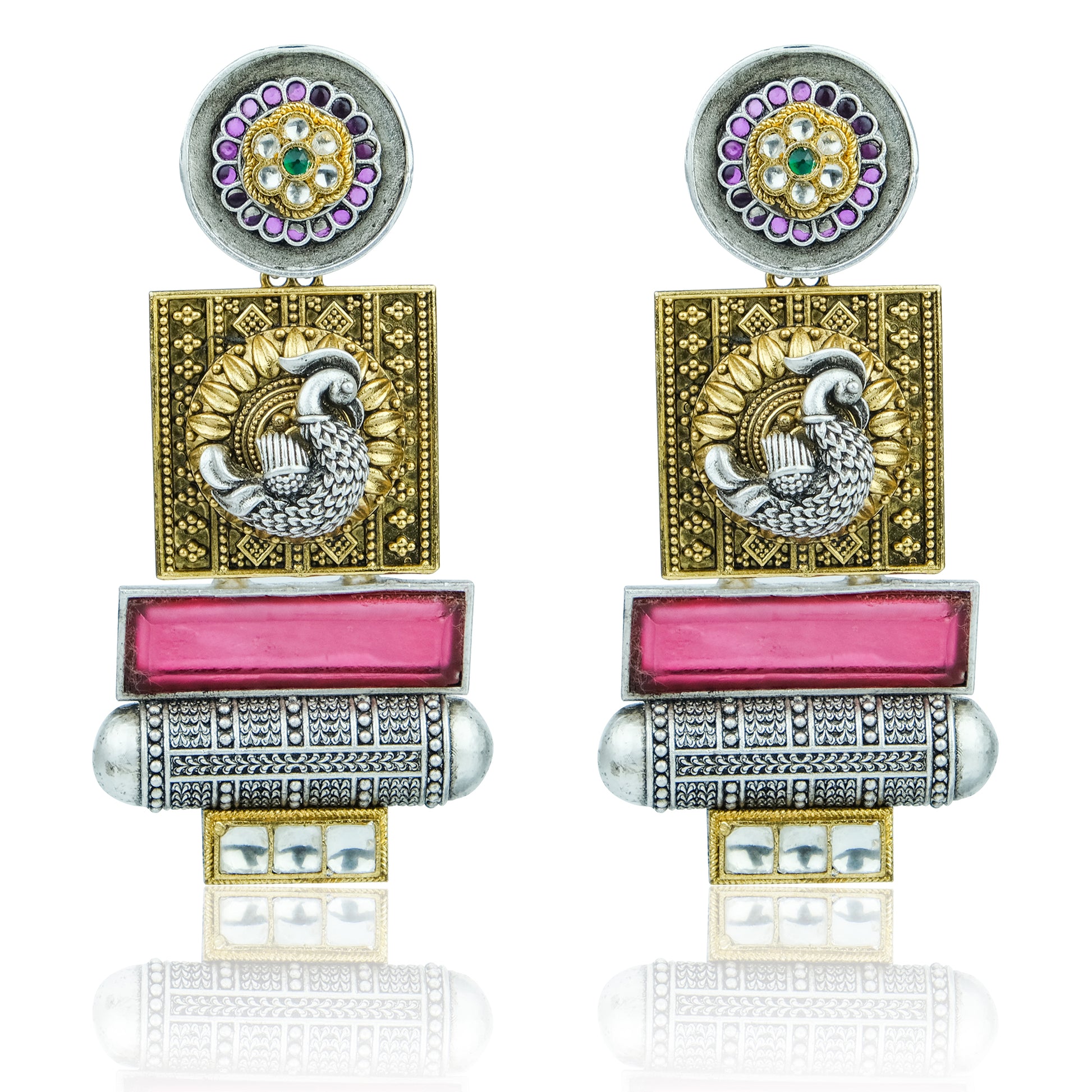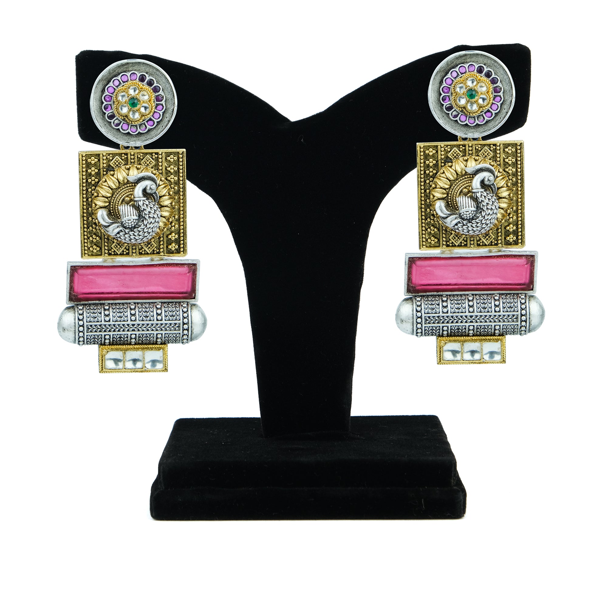 This dual-color oxidized jhumka is sure to turn heads, featuring a unique and eye-catching peacock design. Whether you're in a sari or jeans and a t-shirt, you'll be the talk of the town with these dazzling dangling earrings!