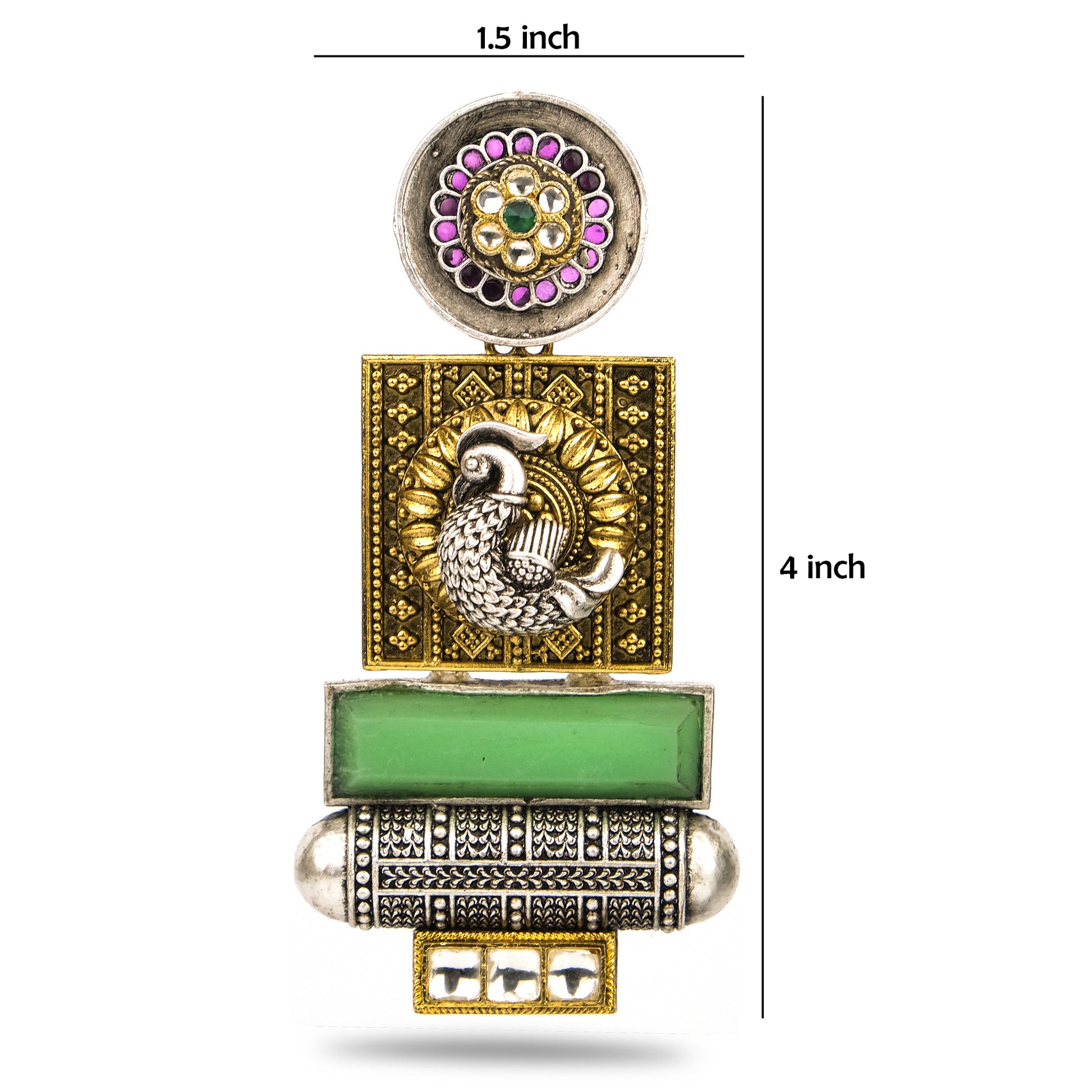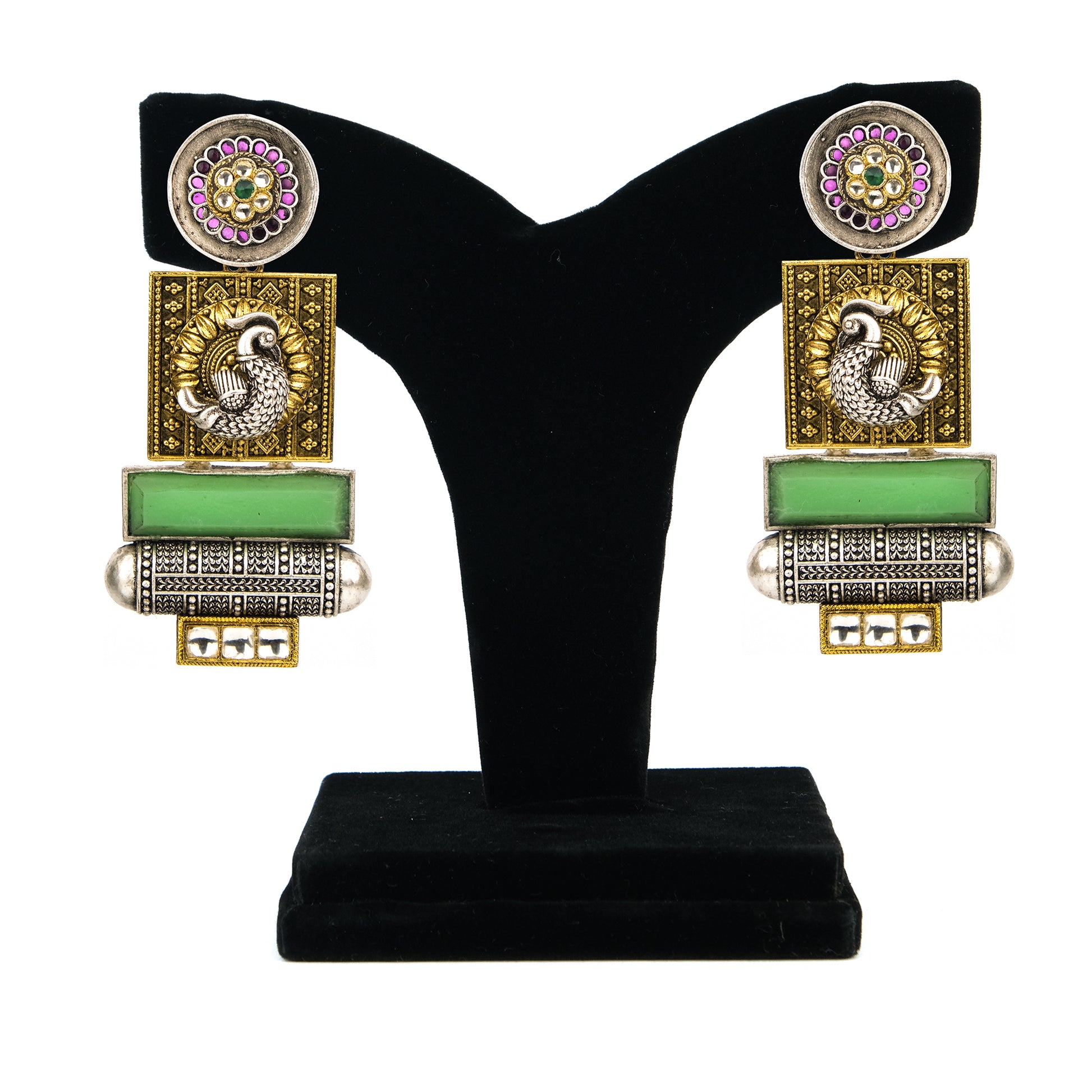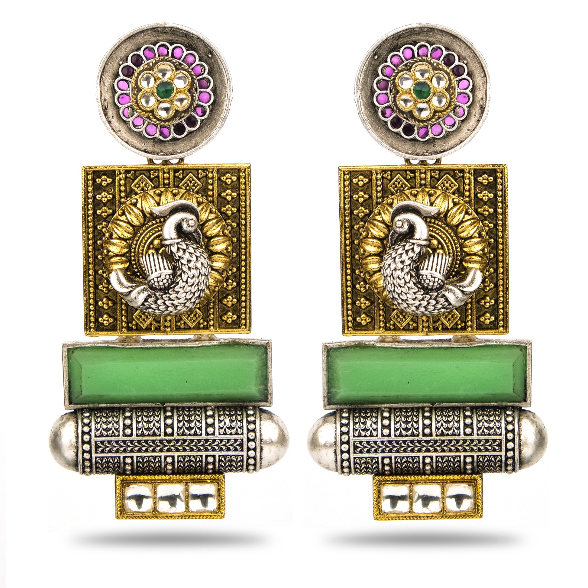 This dual-color oxidized jhumka is sure to turn heads, featuring a unique and eye-catching peacock design. Whether you're in a sari or jeans and a t-shirt, you'll be the talk of the town with these dazzling dangling earrings!