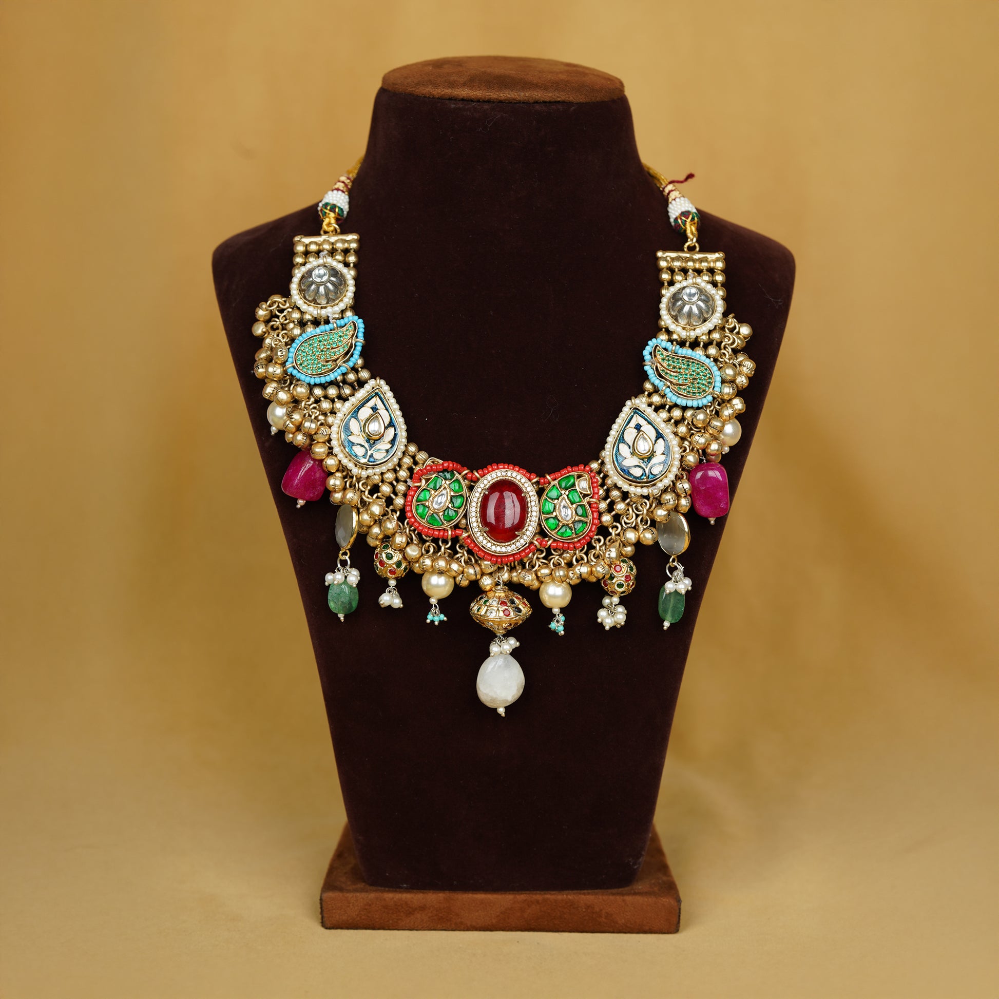 Indulge in royal elegance with our Rajrani Gulnaar Choker, a masterpiece of regal craftsmanship. Featuring a majestic central red stone flanked by green enameled floral motifs and kundan petals, this piece is a kaleidoscope of color and detail. Accented with pearls, rubies, emeralds, and antique gold beads, it embodies the spirit of celebration and heritage. The ornate paisley and floral elements add a divine cultural touch, making it the perfect statement for bridal wear, festive functions, or a queenly evening affair.